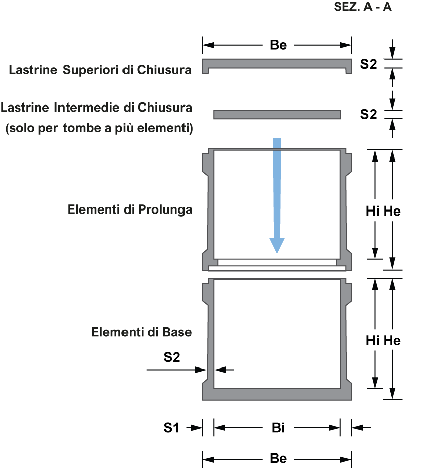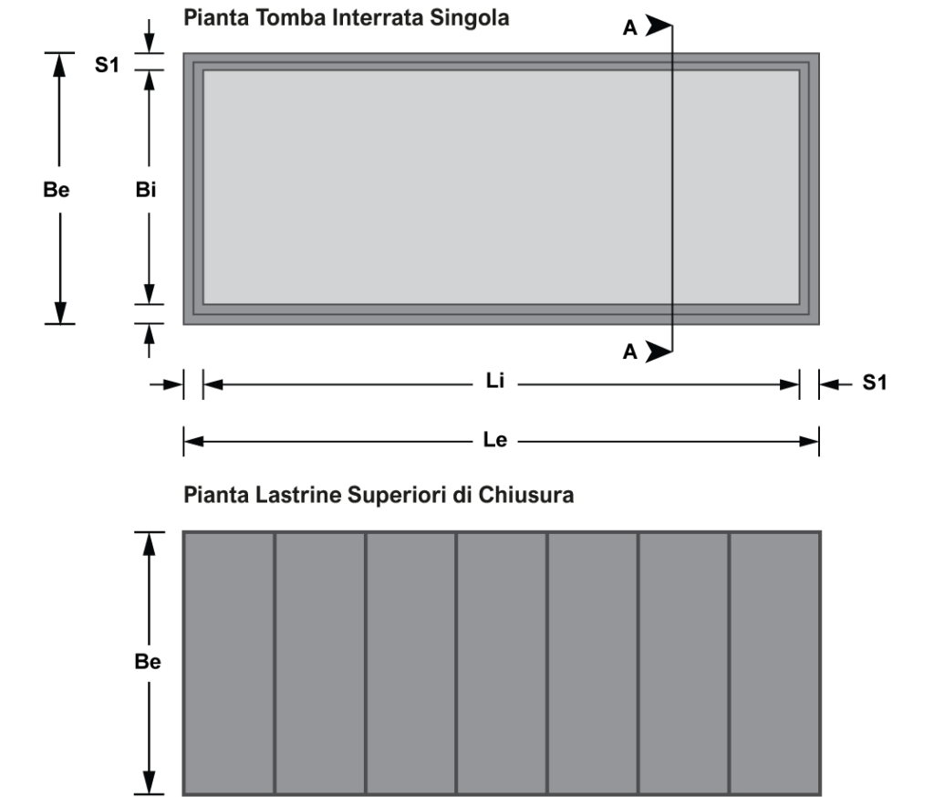Fornitura, trasporto e posa in opera di batteria di n°……loculi (tombe a terra) cimiteriali (dimensioni interne loculo 83xh76x229 cm) in monoblocco costruito in calcestruzzo armato vibrato con resistenza caratteristica C32/40(Rck > 40 N/mmq), classe di esposizione minima garantita XC4, armate con reti d’acciaio di diametro 5 mm tipo B450 A, con barre d’acciaio sciolte di diametro 6 mm o superiore tipo B450C. Costruito in ottemperanza al DPR n° 285 del 10.09.90 e circolare n° 24 del 24.06.93 per ciò che concerne il dimensionamento statico delle solette, l’impermeabilità ai liquidi e ai gas, il dimensionamento e la pendenza verso l’interno. Gli elementi monolitici sono dotati di idonei ganci per il sollevamento e la movimentazione. Struttura realizzata in conformità con quanto previsto dal D.M. 14/01/2018 dalle Norme UNI EN 13369. Prodotto presso stabilimento in possesso dei requisiti di cui alla norma UNI EN ISO 9001 (regime di qualità) e accompagnato da Attestato di Qualificazione per produzione di componenti prefabbricati in C.A.V. in serie Dichiarata, rilasciato da Consiglio Superiore dei Lavori Pubblici – Servizio Tecnico Centrale ai sensi dell’art.9 della Legge 1086/1971.