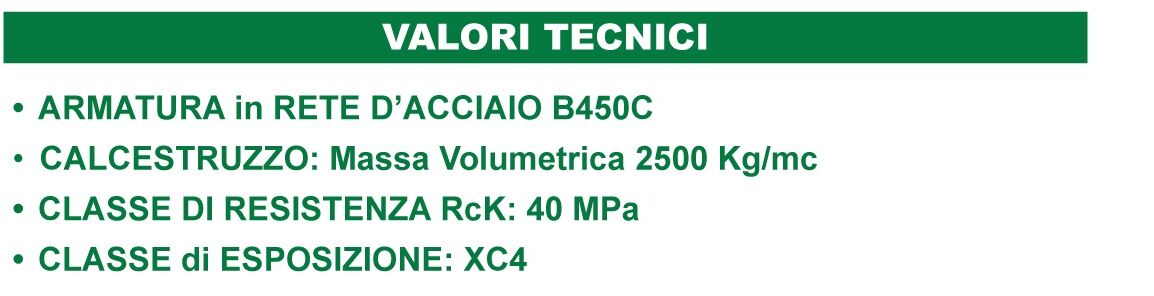 CALCESTRUZZO: Massa volumica 2500 Kg/mc, resistenza a compressione Rck: 40 N/mmq.