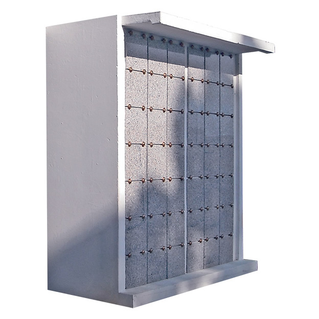 Acqua priva di sali (solfuri e cloruri) secondo UNI EN 1008:2003. Cemento tipo CEM II/B-LL42.5R. Inerti di fiume spaccati lavati e selezionati, dosati secondo adeguata curva granulometrica. Rapporto acqua e cemento max 0.45 secondo norma UNI EN 206 per le classi di esposizione XC4 (resistente alla corrosione indotta da carbonatazione), XS1, XD1 (resistente alla corrosione indotta da cloruri anche di provenienza marina), XF1 (resistente all’attacco dei cicli gelo/disgelo con o senza sali disgelanti), XA1 (resistente ad ambienti chimici aggressivi nel suolo naturale e nell’acqua presente nel terreno). Calcestruzzo: Massa volumica 2300 Kg/mc, resistenza a compressione Rck: 40 N/mmq.