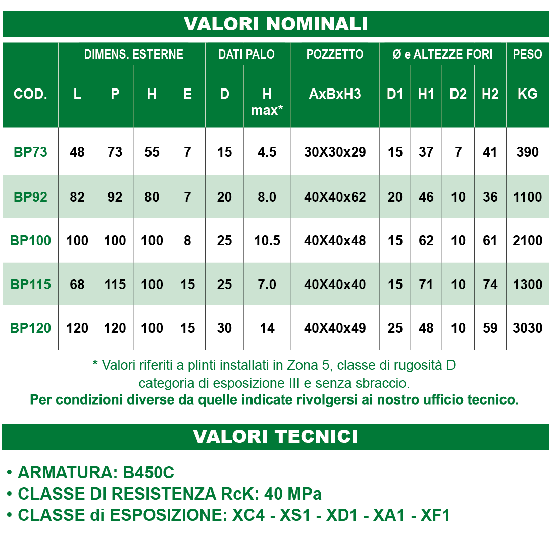 Il plinto portapalo è realizzato secondo le regole generali di fabbricazione, conforme all’utilizzo previsto come plinto di fondazione per pali di altezza variabile fino a 14 mt. fuori terra e che non debbano sopportare carichi di trazione laterale (cavi, agganci di sommità). Il suddetto manufatto è quindi idoneo a essere impiegato per pali con solo carico verticale che sorreggano un punto illuminante e con passaggio di cavi interni al palo. È un monoblocco realizzato in CLS vibrocompresso ad alta resistenza, disponibile in varie dimensioni; è compreso un pozzetto per l’ispezione dei cavi al palo e sono presenti tre impronte cilindriche per il collegamento alla linea.