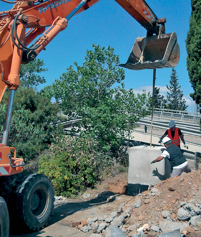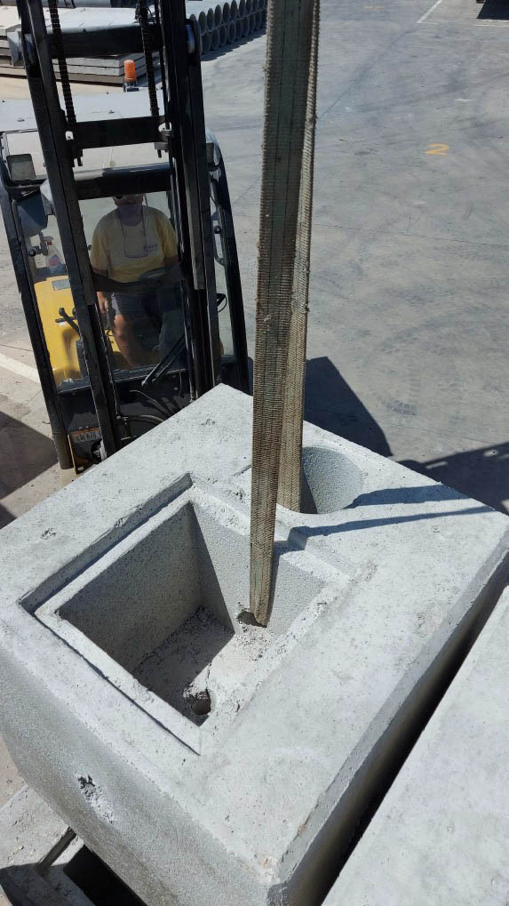 Per il sollevamento e la movimentazione in sito dei plinti portapalo si utilizza un imbrago tramite il foro presente nella parete di separazione tra pozzetto e l’alloggiamento del palo di illuminazione (vedi figura a lato).