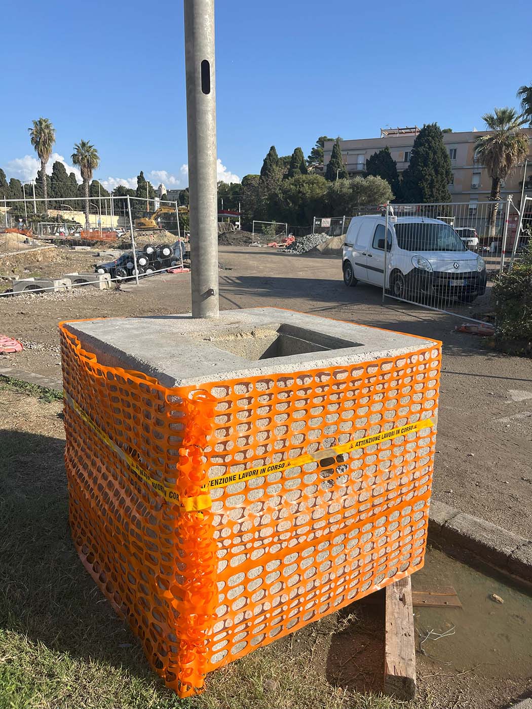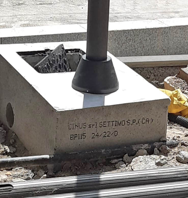 Plinto portapalo di illuminazione, monoblocco in CLS vibrocompresso ad alta resistenza, di dimensioni, cm. …..x…. del peso di Kg. … , compreso pozzetto cm, 40×40 per l’ispezione dei cavi al palo e tre impronte cilindriche per il collegamento alla linea. Realizzati con materiali certificati CE e prodotti in stabilimento certificato secondo la norma UNI EN ISO 9001:2015 “Sistema di Gestione per la Qualità. Calcestruzzo in classe di resistenza a compressione C32/40, conforme alle prescrizioni previste nella norma UNI EN 206-1 per le classi di esposizione XC4 (resistente alla corrosione indotta da carbonatazione), XS1, XD1 (resistente alla corrosione indotta da cloruri anche di provenienza marina), XF1 (resistente all’attacco dei cicli gelo/disgelo con o senza sali disgelanti), XA1 (resistente ad ambienti chimici aggressivi nel suolo naturale e nell’acqua presente nel terreno).
