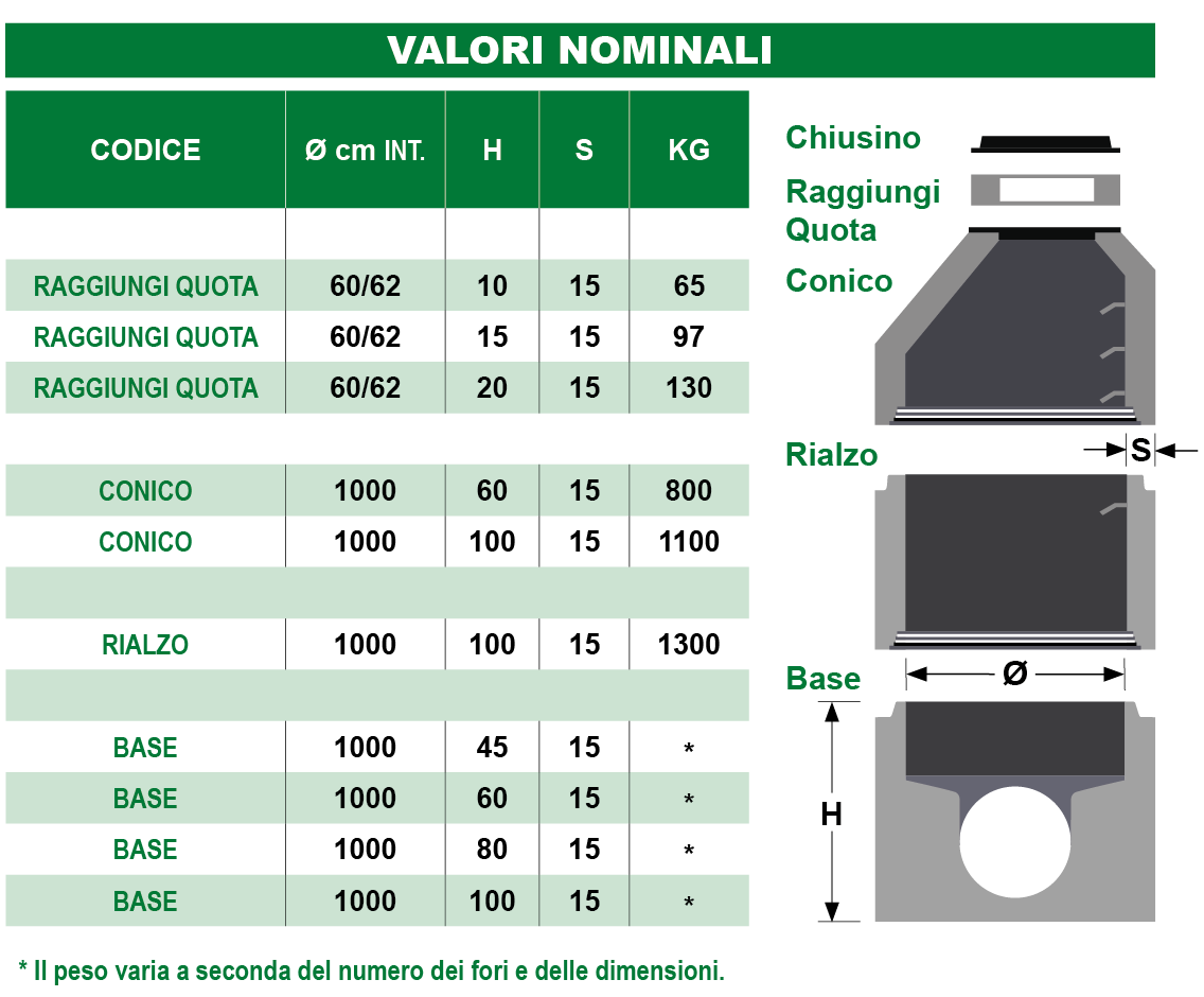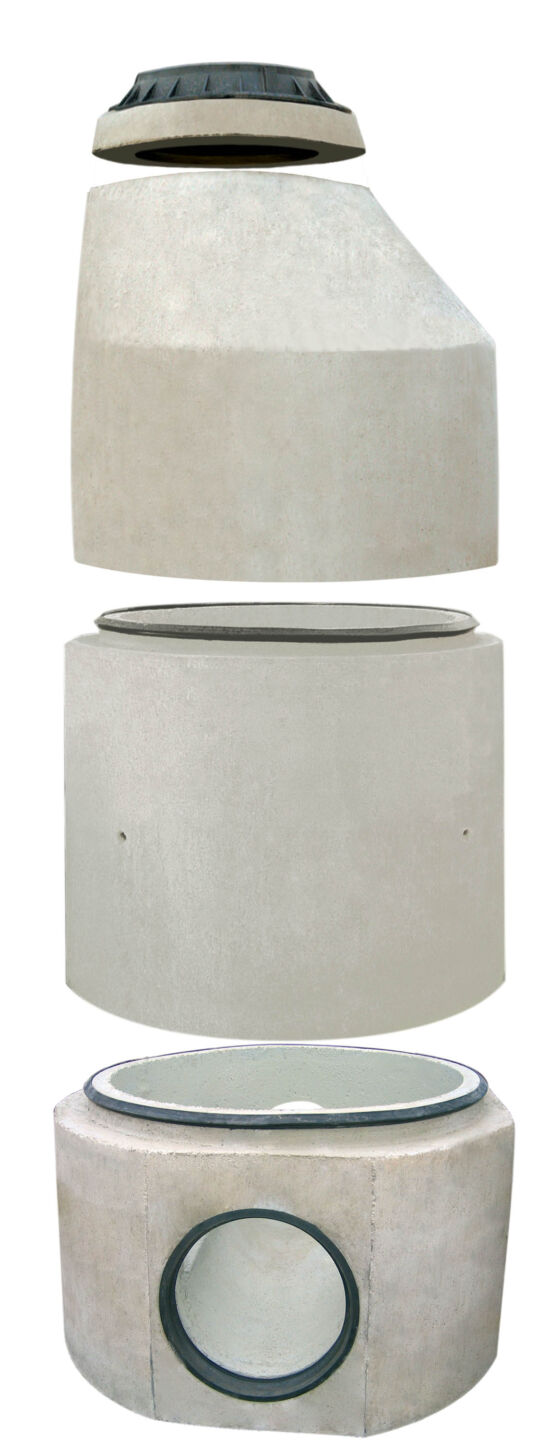 Pozzetto prefabbricato modulare per raccordo e ispezione fognature in calcestruzzo vibrocompresso realizzato a norma, con imbocco che va da 200 a 800 mm, rivestito in epossidico, provvisto di canale di scorrimento atto a garantire la continuità idraulica. L’elemento di base presenterà una camicia integrata in PRFV-PP sagomata con canaletta idraulica del fondo, completo di fori di innesto con guarnizioni di tenuta DN ……….. per tubi in ………………….. (PVC – polietilene – corrugatogres vetroresina – ghisa – acciaio) con entata-uscita munita di anello gomma elastomerico, giunti a mezzo spessore, pioli antiscivolo a norma UNI EN 13101, elemento di copertura idoneo, prolunghe ed elemento terminale tronco-conico.