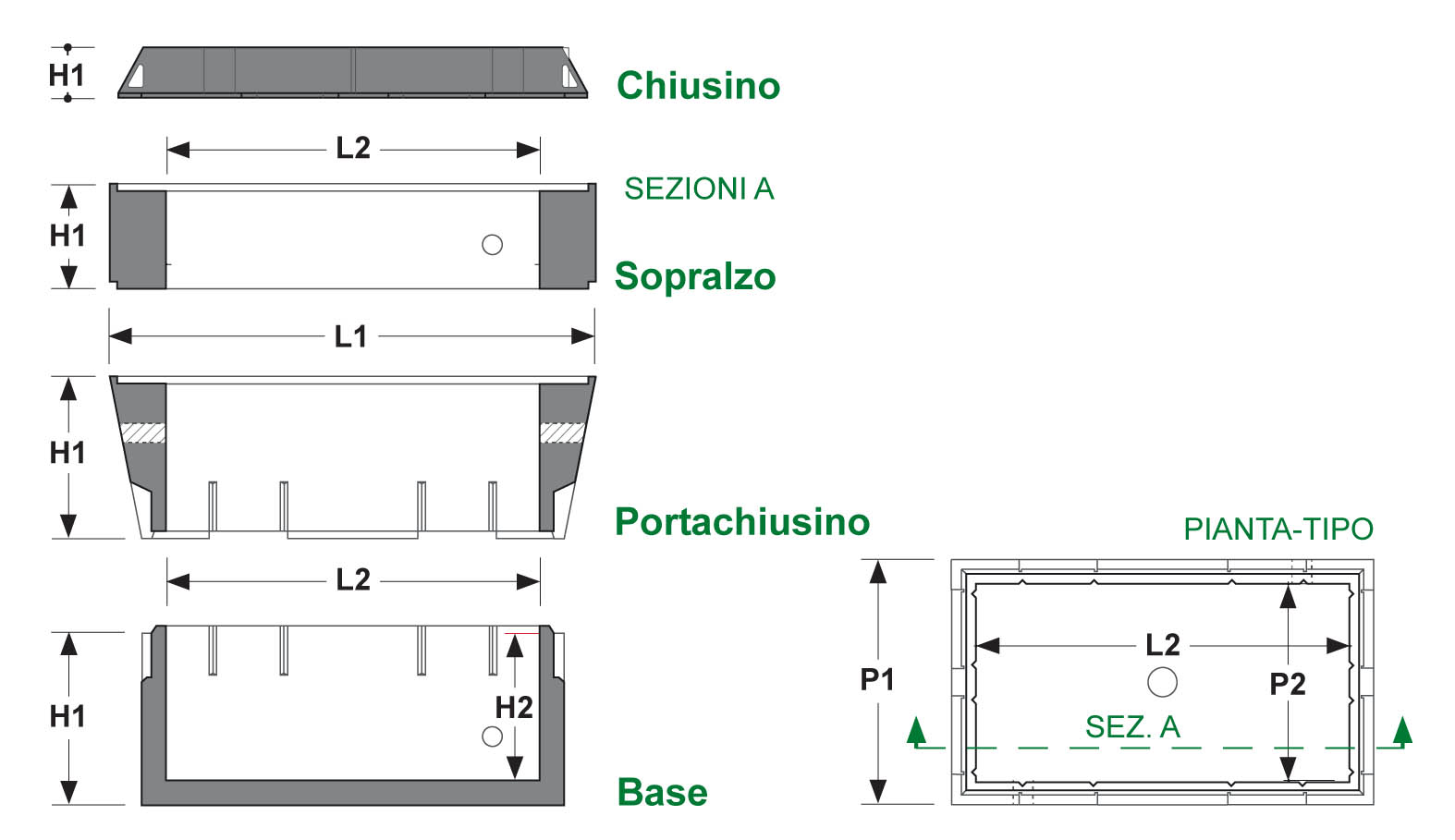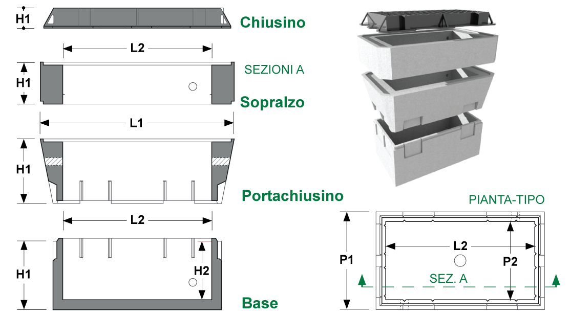 Il pozzetto modulare 40×76 (elemento di base, elementi di sopralzo e anello per chiusino) è progettato e realizzato per installazioni in tutto il territorio nazionale, per resistere, con la dovuta sicurezza, ai carichi stradali più gravosi di I° cat. e sollecitazioni sismiche, ai sensi del D.M. 14/01/2008. Ogni elemento modulare è dotato, nel bordo di accoppiamento, di rialzi per un sicuro vincolo di unione ed è munito di sistema per una sicura movimentazione, distinto in fori passanti o ganci di presa ad occhiello in acciaio assicurati alla struttura. Il tipo 76×40 si compone di elemento di base di spessore 5 cm, anello portachiusino di altezza 30 cm ed elemento di sopralzo di altezza 20 cm sui quali viene installato il chiusino in ghisa.