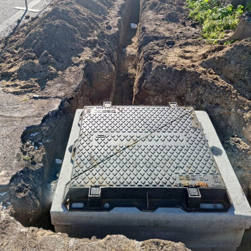 Pozzetto modulare in calcestruzzo per infrastrutture di reti per telecomunicazioni a banda larga, di dimensioni interne pari a 40×76 cm, composto da: un elemento di base ed un elemento portachiusino, dotati di setti a frattura per l’alloggiamento di cavi, un elemento di sopralzo di altezza pari a 20 cm. Corredato di Attestato di Qualifica produzione in serie dichiarata, rilasciato dalla Presidenza del Consiglio Superiore dei Lavori Pubblici.