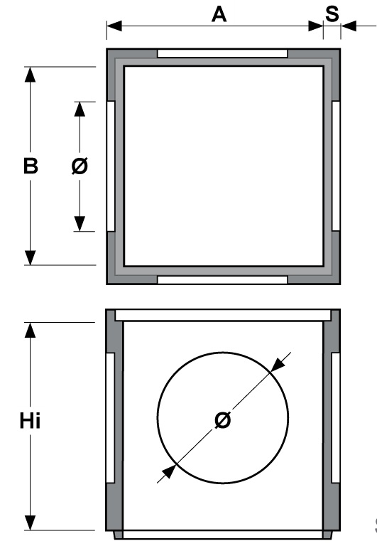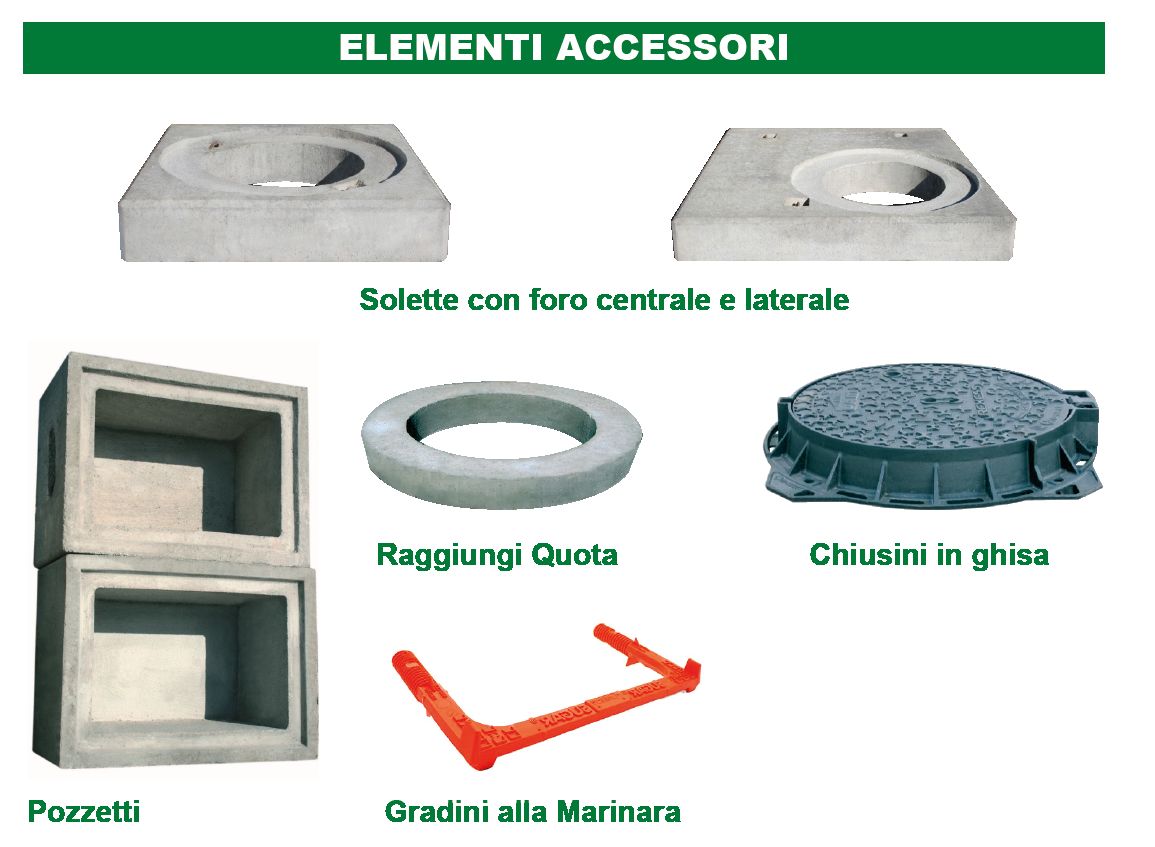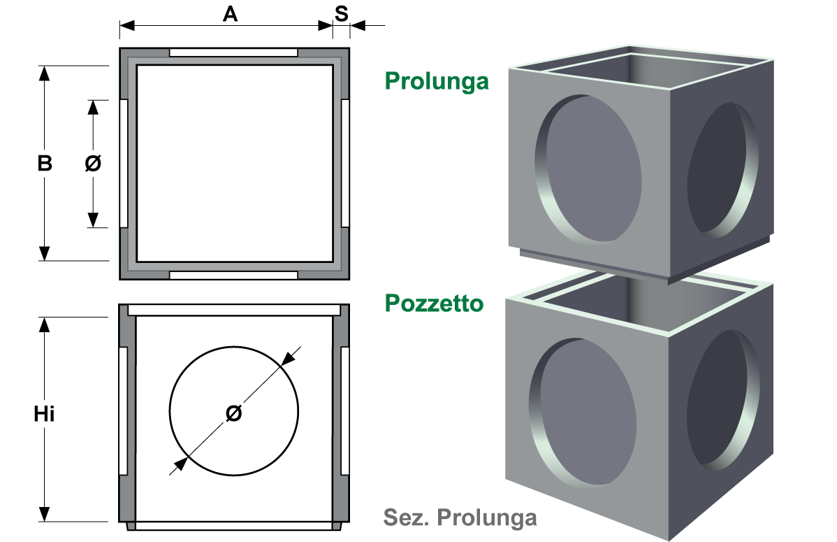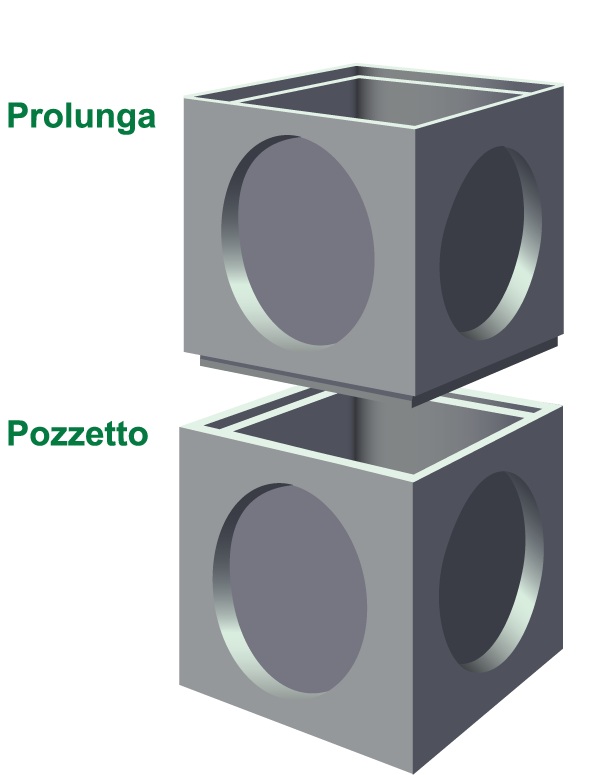 Struttura verticale a tenuta d’acqua utilizzata per il collegamento di condotte per modificarne la direzione e/o la quota. Il prodotto può essere fornito con fori di diverso diametro. A richiesta è possibile realizzare prolunghe con “cavallotto” passatubo per l’ingresso delle tubazioni Incastro superiore del tipo maschio/femmina a mezzo spessore.