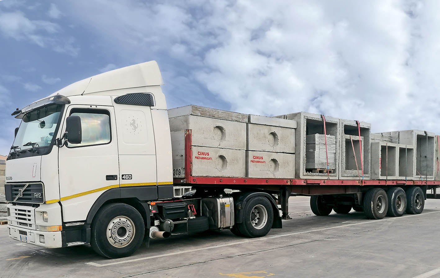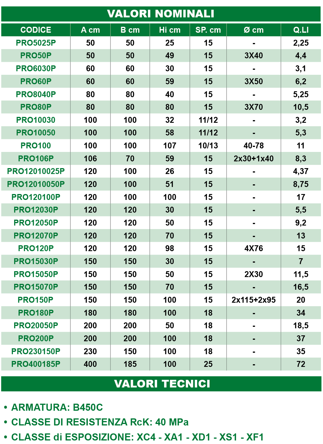 Acqua priva di sali (solfuri e cloruri) secondo UNI EN 1008:2003. Cemento tipo CEM II/B-LL42.5R. Inerti di fiume spaccati lavati e selezionati, dosati secondo adeguata curva granulometrica. Rapporto acqua e cemento max 0.45 secondo norma UNI EN 206 per le classi di esposizione XC4 (resistente alla corrosione indotta da carbonatazione), XS1 (resistente alla corrosione indotta da cloruri anche di provenienza marina), XF1 (resistente all’attacco dei cicli gelo/disgelo con o senza sali disgelanti), XA1 (resistente ad ambienti chimici aggressivi nel suolo naturale e nell’acqua presente nel terreno). Armature interne in acciaio ad aderenza migliorata controllate in stabilimento, di tipo B450C (ex FeB44K). Calcestruzzo: Massa volumica 2300 Kg/mc, resistenza a compressione Rck: 40 N/mmq.