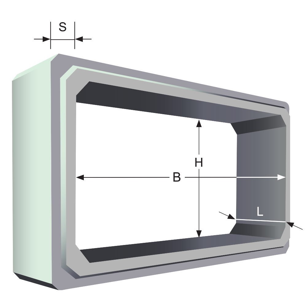 Tubo preformato a sezione rettangolare di tipo scatolare in calcestruzzo armato con giunzione a mezzo spessore a maschio e femmina con o senza guarnizione, utilizzato per la creazione di cunicoli interrati per convogliamento e l’immagazzinamento di materiali e lo scorrimento di sostanze liquide.