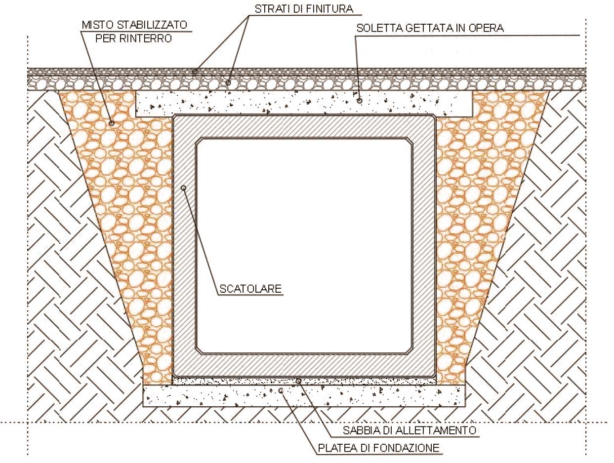 Fornitura e posa in opera di elementi scatolari prefabbricati monolitici in calcestruzzo armato e vibrato, a sezione rettangolare per la creazione di condotte idrauliche, di servizi e attraversamenti sotto rilevato stradale o corpo d’argine. Con sistema di giunzione con incastro a bicchiere (a richiesta con anello di tenuta in gomma conforme UNI EN 681-1).