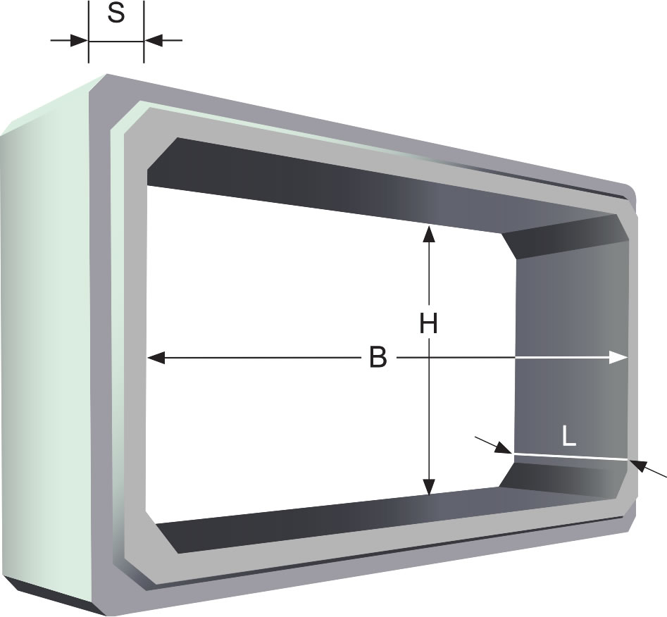 Tubo preformato a sezione rettangolare di tipo scatolare in calcestruzzo armato con giunzione a mezzo spessore a maschio e femmina con o senza guarnizione, utilizzato per la creazione di cunicoli interrati per convogliamento e l’immagazzinamento di materiali e lo scorrimento di sostanze liquide.