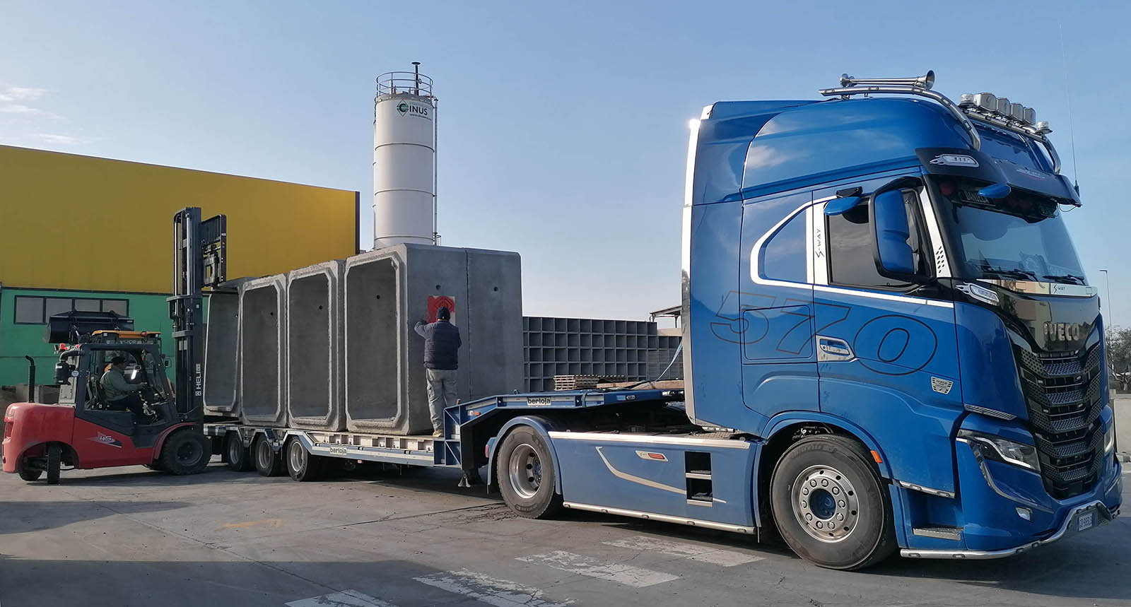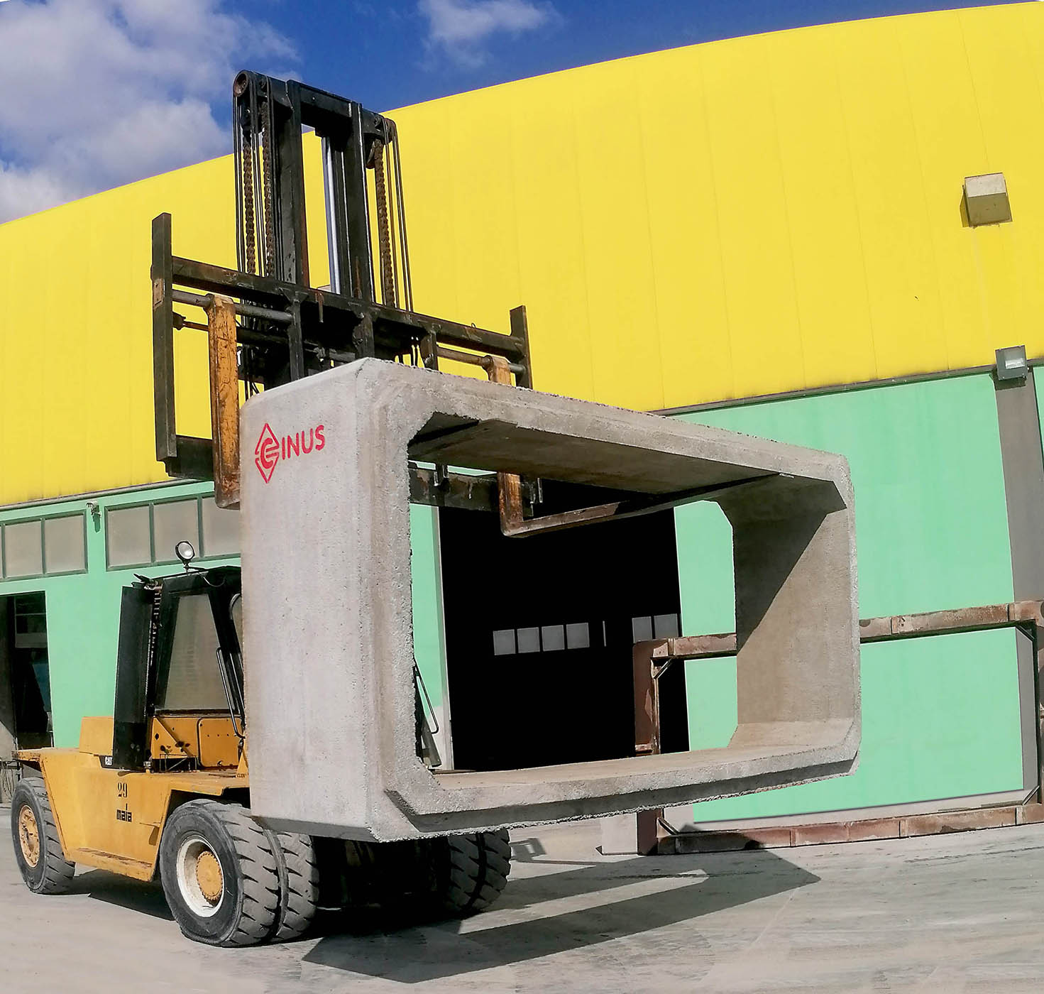 Acqua priva di sali (solfuri e cloruri) secondo UNI EN 1008:2003. Cemento tipo CEM II/B-LL42.5R. Inerti di fiume spaccati lavati e selezionati, dosati secondo adeguata curva granulometrica. Rapporto acqua e cemento max 0.45 secondo norma UNI EN 206 per le classi di esposizione XC4 (resistente alla corrosione indotta da carbonatazione), XS1, XD1 (resistente alla corrosione indotta da cloruri anche di provenienza marina), XF1 (resistente all’attacco dei cicli gelo/disgelo con o senza sali disgelanti), XA1 (resistente ad ambienti chimici aggressivi nel suolo naturale e nell’acqua presente nel terreno). Armature interne in acciaio ad aderenza migliorata controllate in stabilimento, di tipo B450C (ex FeB44K). Calcestruzzo: Massa volumica 2300 Kg/mc, resistenza a compressione Rck: 40 N/mmq.